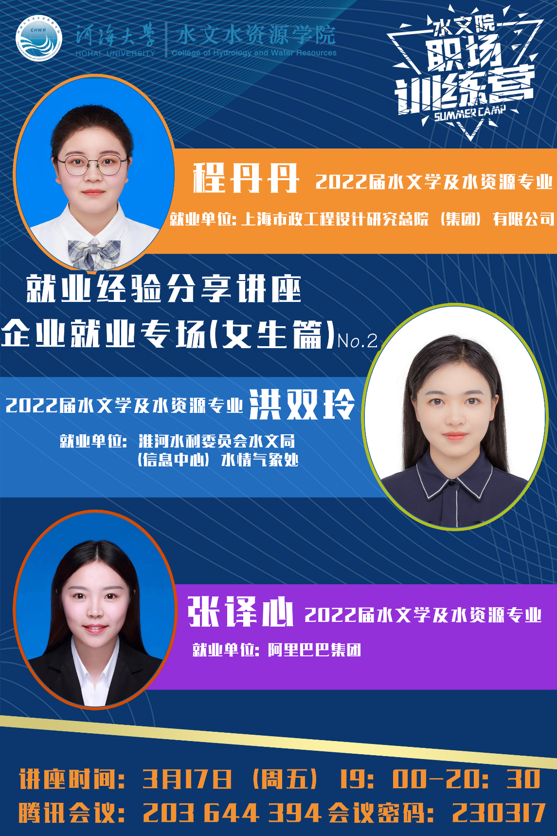 阳春三月,又是新一轮春招来到。为精准高效做好指导服务,扎实开展就业帮扶,提高女生就业成功率,3月17日,小说狂人 开展了第四期职场训练营活动,邀请2022届水文学及水资源专业程丹丹、洪双玲及张译心三位优秀女毕业生分享企业校招就业经验。本次活动由研究生辅导员林彦老师主持。