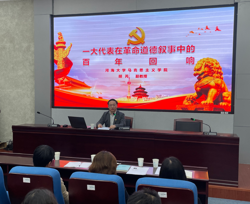 为推动学院党史学习教育走深走实,3月31日下午,水文水资源党委邀请学校党史学习教育宣讲团成员、马克思主义学院胡芮副教授作了题为《一大代表在革命道德叙事中的百年回响》专题报告。学院党委委员、领导班子成员、师生党支部书记、师生党员代表、团支部书记等聆听报告。院党委书记孔祥冬主持报告会。