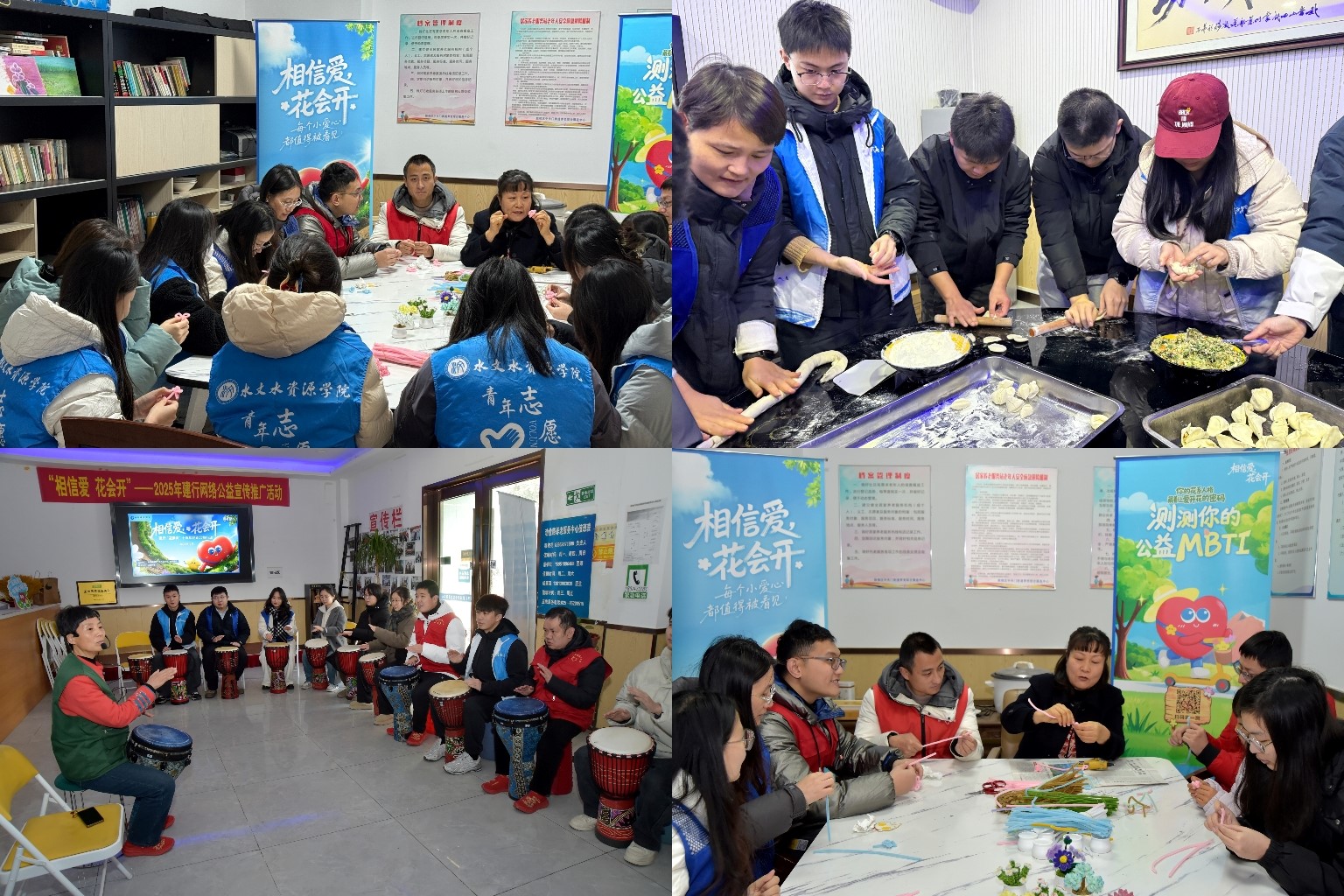 在互动实践环节,志愿者们与博爱学员围坐一堂,开展了形式多样、内容丰富的交流活动。在助老助残爱心餐厅,志愿者与学员们分工明确、协作默契,通过揉面、擀皮、包饺子等环节,共同制作冬日暖心餐食;在手工创作区,志愿者协助学员们完成了一件件精美的手工艺品,现场洋溢着温馨和谐的氛围;在非洲鼓体验区,现场气氛尤为热烈,在专业老师的指导下,志愿者与学员们逐渐从节奏生疏到鼓点整齐,激昂欢快的鼓声将活动推向了高潮。