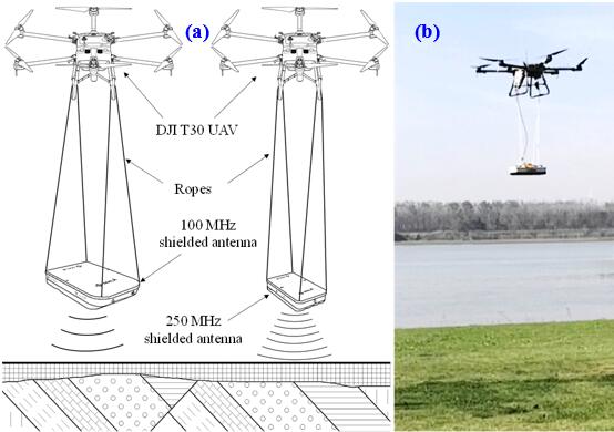 研究团队设计并构建了两套无人机载探测系统:(1)多高度无人机载频域电磁系统(UAV-FDEM,图1):该系统专注探测浅地表三维电导率分布,通过不同飞行高度的扫描式测量,采集随深度变化的电磁响应数据,反演得到高精度三维地下电导率模型,有效圈定地下含水体;(2)多频无人机载地质雷达系统(UAV-GPR,图2):该系统用于精准勘测地表介电参数(介电常数与电导率),通过搭载不同中心频率的雷达天线,采用多高度测量策略,有效分离并估算这两种关键介电参数,为地表含水量和盐分分布的快速制图提供可靠依据。