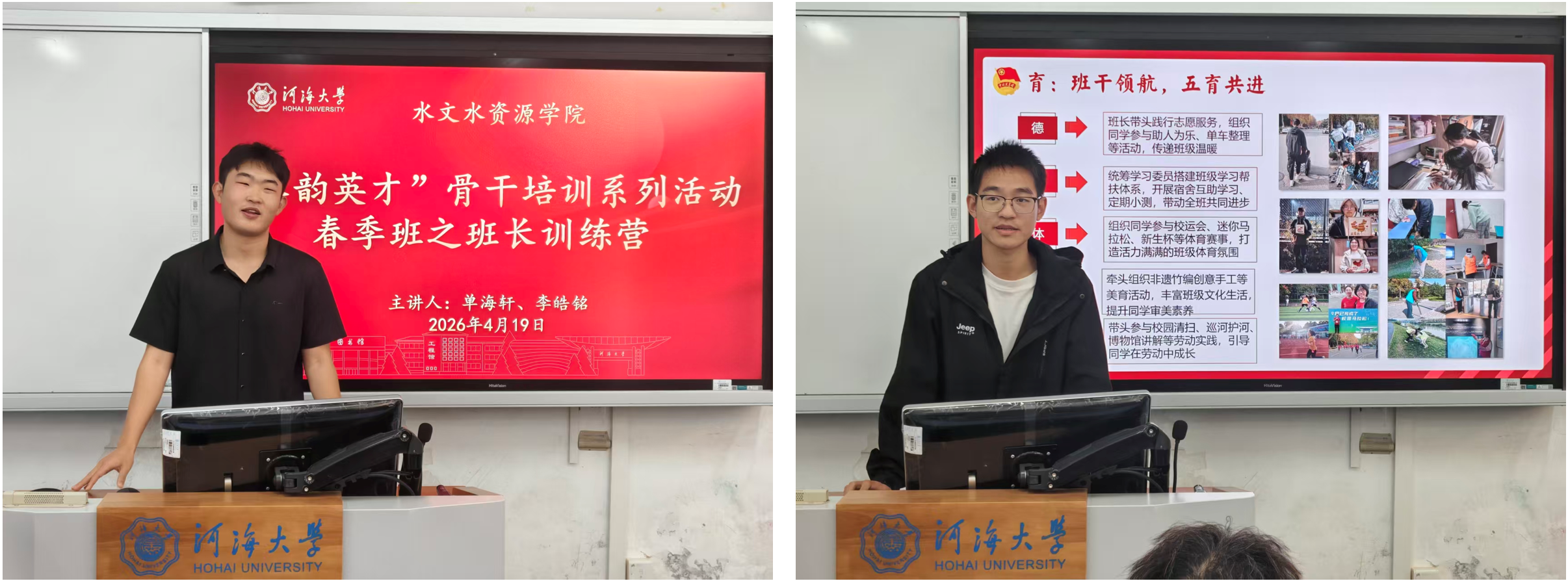 培训立足新时代学生骨干定位,明确学生骨干既是班级事务的管理者,更是服务同学的贴心人,需兼具问题解决的“硬能力”与凝聚人心的“软素质”。分享环节中,2024级水务三班班长单海轩结合班级奖学金覆盖率35%的实践成果,从素质培养、集体活动、文体建设三方面,详解班级管理制度搭建与工作细节把控;2024级水文一班班长李皓铭以班级凝聚力建设为核心,通过多个班级活动案例,倡导班长争做师生沟通的“桥梁”,在奉献与担当中引领班级共同成长。