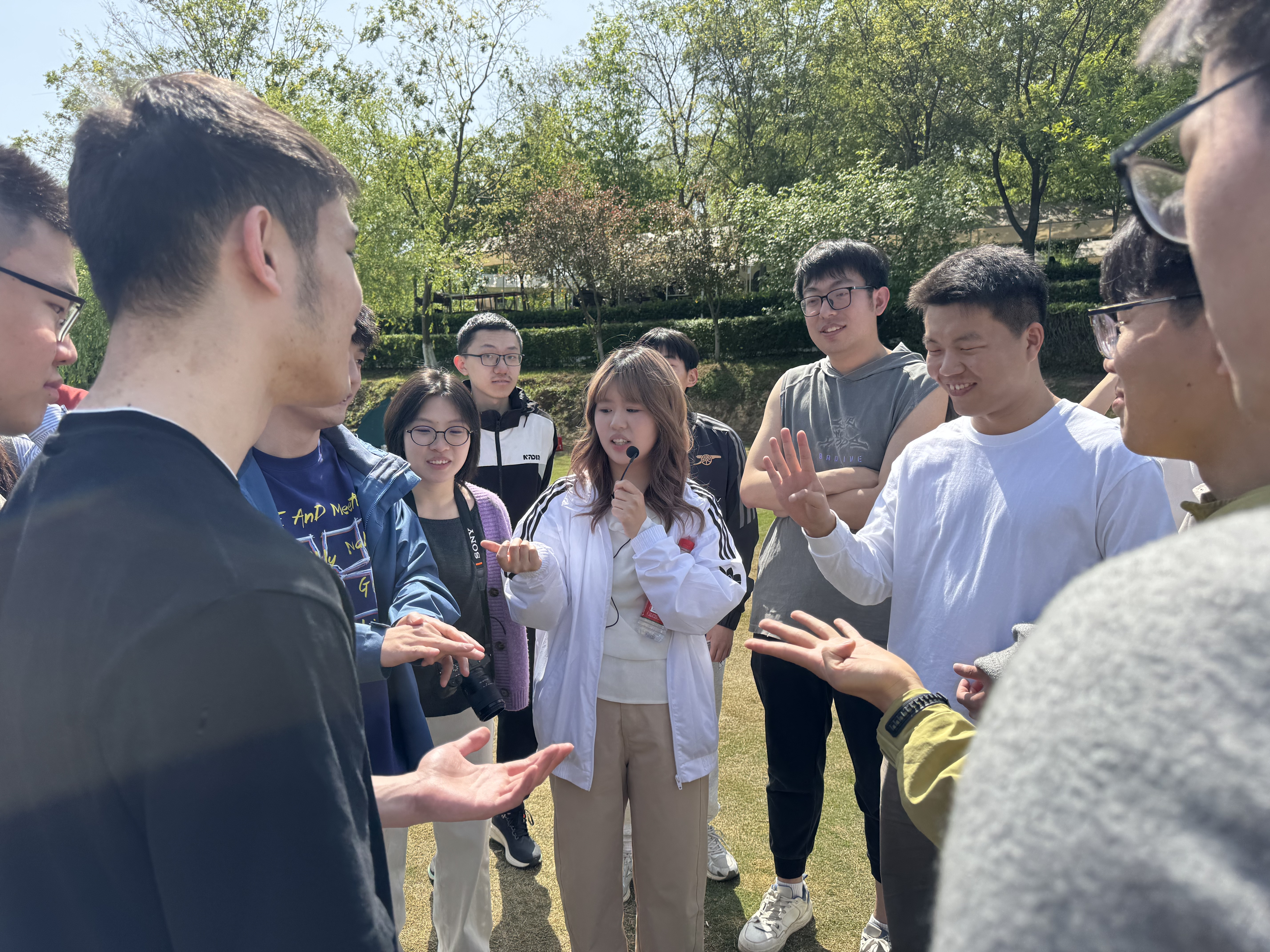 春日午后,阳光和煦,村落的自然风光与文艺气息交织,为大家提供了放松身心的理想环境。活动伊始,同学们分组参与趣味游戏并拍摄小组创意照片。活动设置“我有你没有”、反向指令、听歌识曲三项简单易行、参与度高的团队游戏。其中,“我有你没有”考验大家的生活经历与脑洞创意;反向指令比拼反应速度与专注力;听歌识曲环节则涵盖了经典老歌与热门金曲,现场抢答气氛热烈。获胜小组还赢得了零食礼包奖励,增添了活动的趣味性与成就感。