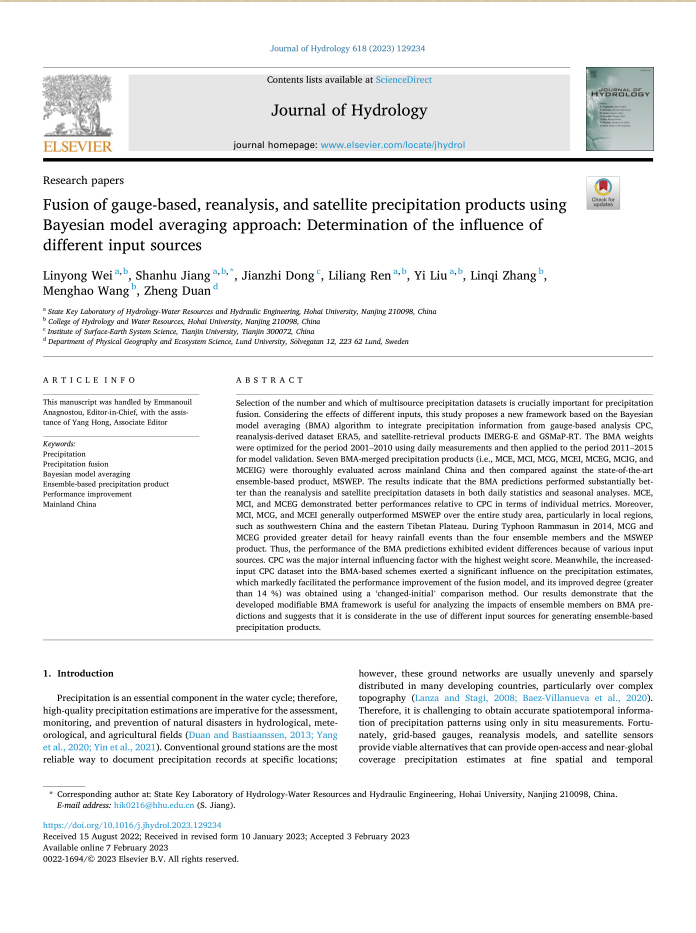 Wei, L., Jiang, S., Dong, J., Ren, L., Liu, Y., Zhang, L., Wang, M., Duan, Z., 2023. Fusion of gauge-based, reanalysis, and satellite precipitation products using Bayesian model averaging approach: Determination of the influence of different input sources. Journal of Hydrology, 618, 129234. //doi.org/10.1016/j.jhydrol.2023.129234